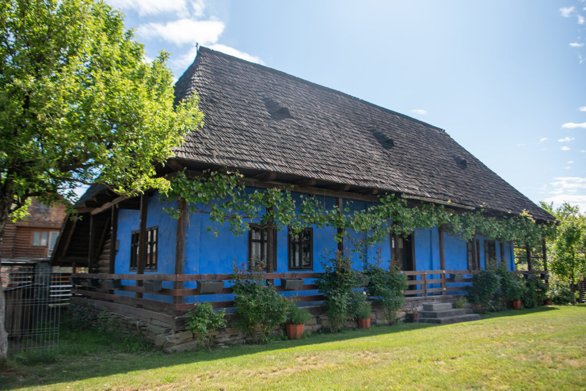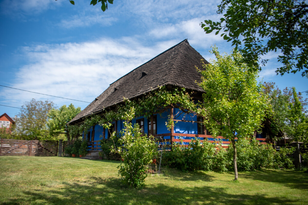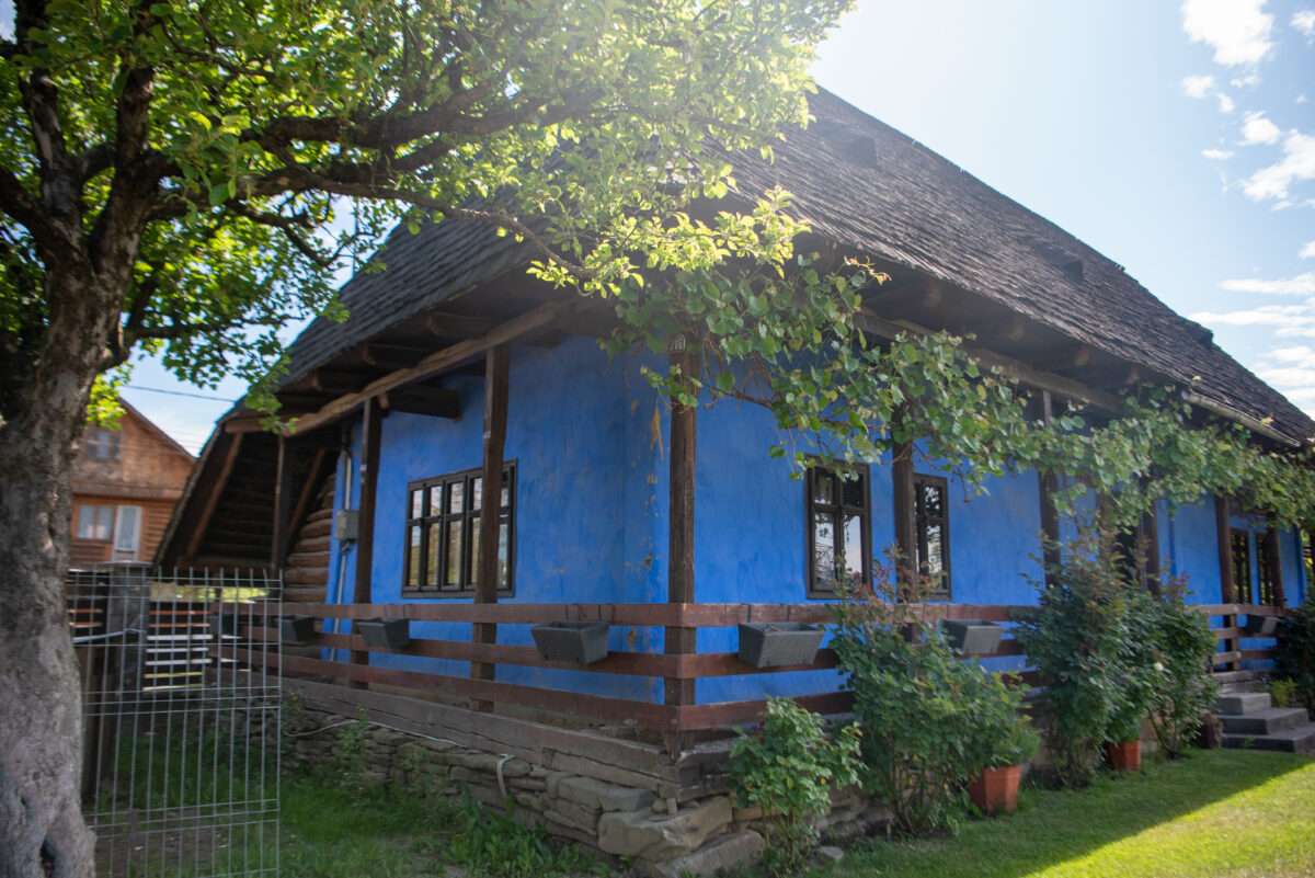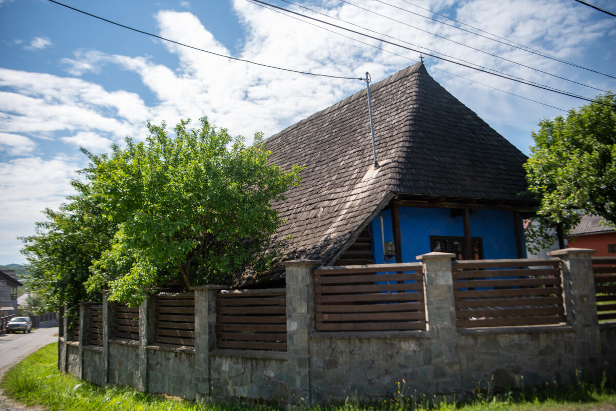 Construcția se remarcă printr-o arhitectură specifică rurală, având prispă pe trei laturi ale casei, cu o zonă de depozitare închisă cu scânduri în spate. Construcția prezintă elemente de lemn sculptate specifice zonei în elementele de lemn ale prispei și se remarcă prin culoarea albastră a fațadelor și prin acoperirea cu șindrilă, având două ochiuri specifice în învelitoare. Tâmplăriile de lemn sunt cele originale.